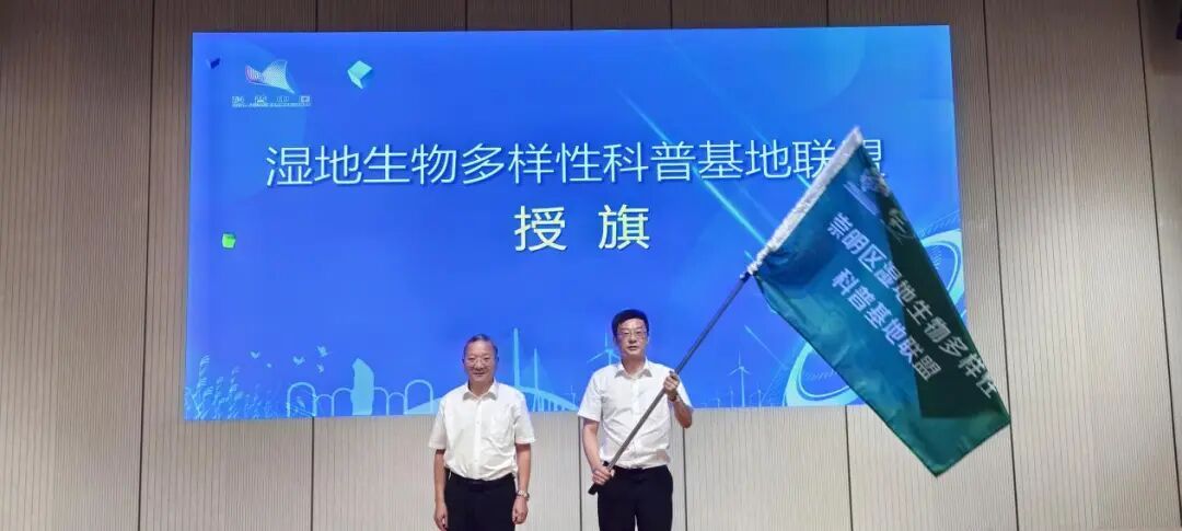 ▲区科委党组书记张旭日为湿地生物多样性科普基地联盟代表授旗