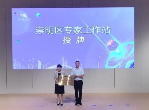 ▲市科协副主席金燕子为崇明区专家工作站授牌