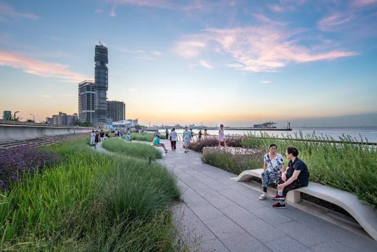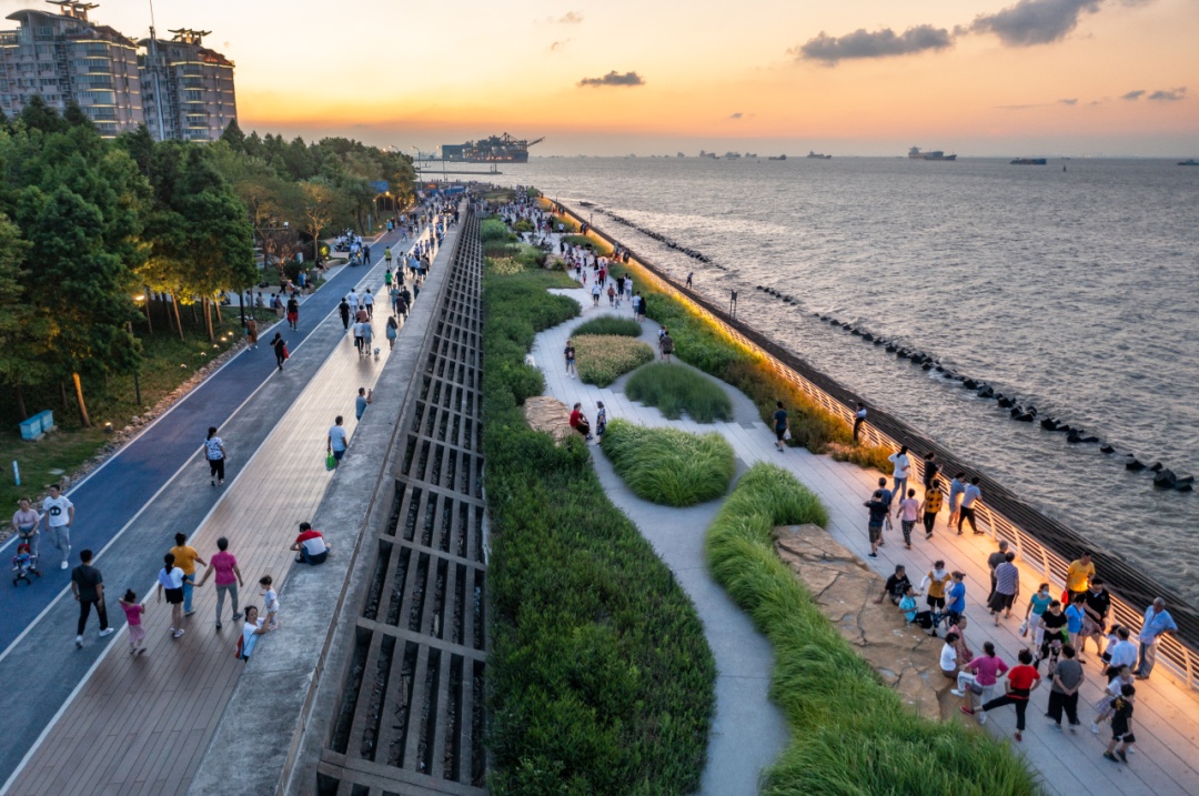 值得一提的是,宝山滨江这段岸线的设计秉持“生态安全一体化”理念,滨水岸线本身承担长江一线大堤的防汛功能,在确保达到“200年一遇高潮位+12级风”防汛标准的同时为公众提供了2000亩的绿化公园开放空间,既确保了市民游玩的安全,也展现了现代化堤防的生态性与功能性,让“安全岸线”真正成为服务市民、彰显上海滨江魅力的“生活岸线”。