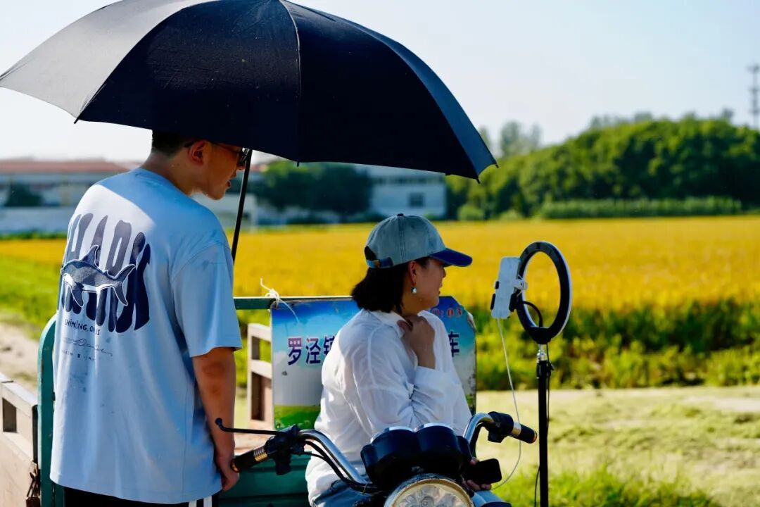 作为上海首个本土选育的国庆稻品种,具有全生育期约118天、9月中下旬收割的特性。该品种米粒晶莹剔透,蒸煮后米饭软糯适中,冷却后不易回生,尤其是带有独特的“芋艿香”或“爆米花香”,食味品质极佳,在市场上很受消费者青睐。 田野间除了忙碌的收割场景,罗泾镇官方农产品对外展销平台“泾灿灿”直播间的身影也格外亮眼。主播手持设备穿梭在田埂上,镜头实时捕捉收割机作业的动态,从稻穗被卷入机身,到金黄稻谷倾泻而出的瞬间,都清晰呈现在直播间画面中。主播一边向网友介绍“松早香一号”的品种特性,一边展示饱满的稻粒,还不时与屏幕前的观众互动,解答“新米何时能买”“口感和普通大米有啥区别”等问题,让网友隔着屏幕也能感受丰收的喜悦,提前锁定这份本土鲜香。