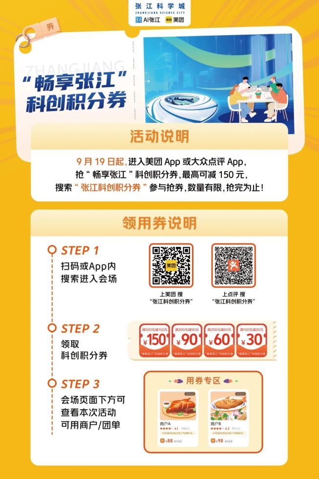 记者了解到,本次科创积分券将在美团APP、大众点评APP进行申领与发放,亦可通过“Ai张江”APP内相关入口跳转至“美团”APP活动页面后领取。