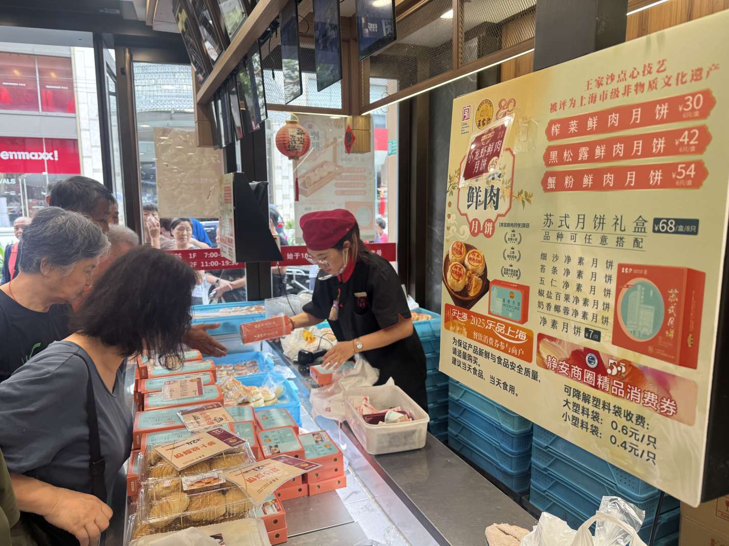 随着中秋临近,门店销量正稳步攀升。据了解,王家沙现烘苏式月饼每日限量出炉,供应时间为8:00-17:00(每日时间略有调整)。不少老顾客已早早前往门店采购,市民陈阿姨表示,全家最爱吃的是细沙和五仁月饼,“味道很好,每年都会来买,已经成为了一家人中秋节的一种仪式感。”