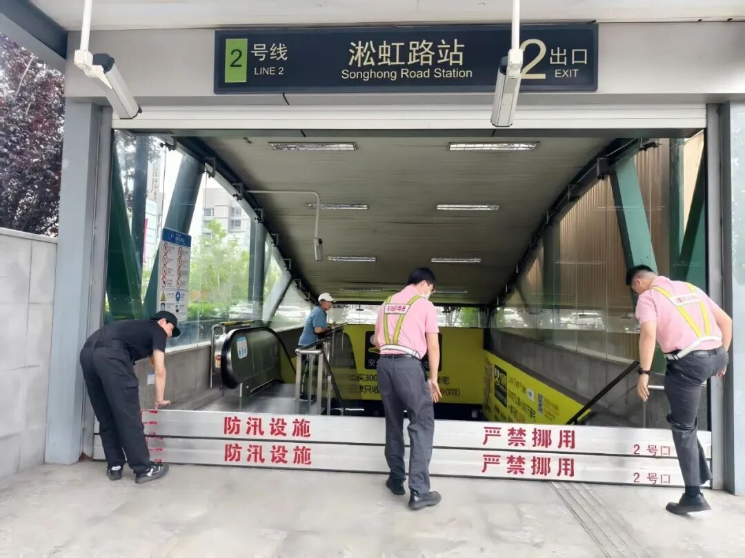 演练模拟台风强降雨天气导致地铁站周边出现积水险情。警报响起后,各单位迅速进入应急状态:轨交民警第一时间赶赴现场疏导人流、维持秩序;地铁站工作人员快速布设防洪挡板与沙袋,严防雨水倒灌,并加强站内设备排查和乘客引导;门责队伍不仅协助地铁站加固防汛设施,还全面巡查周边道路排水和户外设施安全,及时清理积水杂物;大融城也主动参与,在地铁出口协助疏散乘客,并在商场重点区域设置防水设施,同步建立信息共享机制,实现险情实时互通。