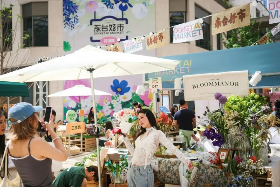 东台路以前有一座花鸟市场。今年春天,“新天地东台里”延续城市记忆,在天幕广场办了一次花市,植入70余家市集摊位,很多老居民也来了,人们一边赏花,一边消费。类似市集活动,有望成为常态。