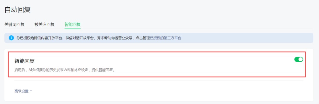 第一步,开启分身。在公众号PC端后台“互动管理”内点击“自动回复”,即可开启“智能回复”。