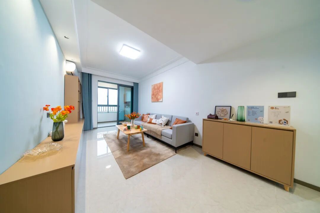 超大客厅 + 连通景观阳台,孩子能自由跑跳、晒太阳、玩玩具,家长在沙发上就能照看。