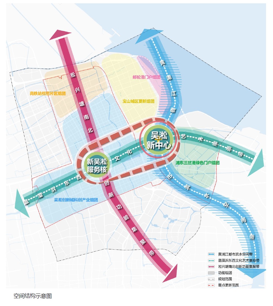 《大吴淞地区专项规划》是上海首个突破行政边界的重点地区专项规划,覆盖宝山、浦东、静安、杨浦四区,总面积约110平方公里。 宝山邮轮滨江地区作为大吴淞规划的“宝山城市更新组团+邮轮港门户组团”的组合体,将深度融入长三角一体化发展格局,依托高铁宝山站这一重要枢纽节点,强化与上海中心城区及周边城市的快速联系。 宏伟的蓝图离不开一笔一划绘就,如今,宝山正通过这“三箭齐发”区域城市更新的首要之箭,不断实现从“生产岸线”向“生活岸线”的转型,也通过大吴淞地区专项规划的实施,打破行政边界壁垒,以“蓝绿交织、清新明亮”为底色,将构建“一核三带五组团”的空间布局,优化现代化人民城市体系,推动形成功能互补、错位发展的现代化城市群协同发展模式。