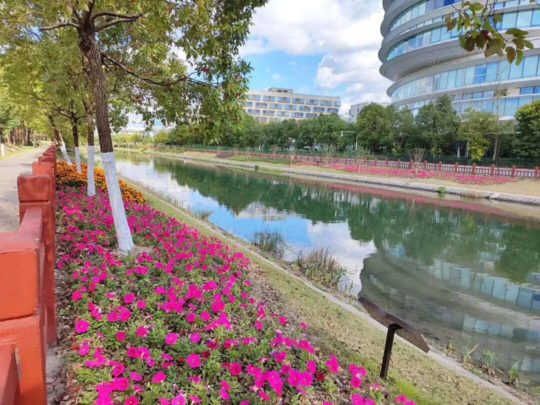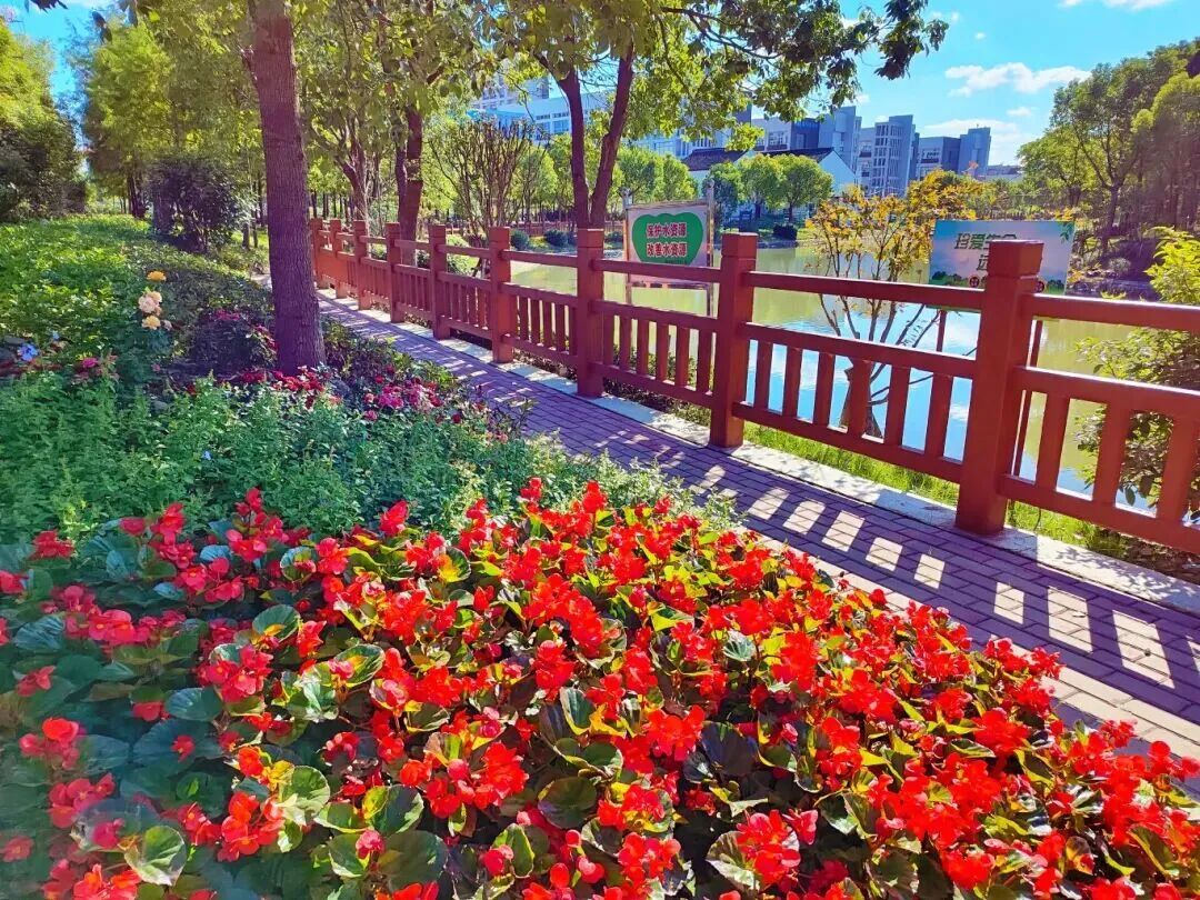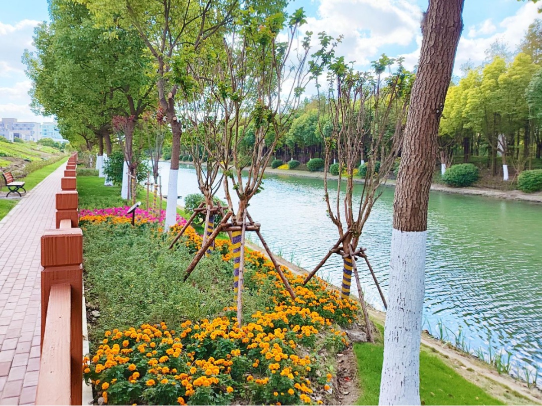 东河之畔,翠芦莉、矮牵牛、美丽月见草次第开放,红叶李、紫薇、桂花错落其间。草本与灌木、乔木与水生,四季更迭,各有风姿。