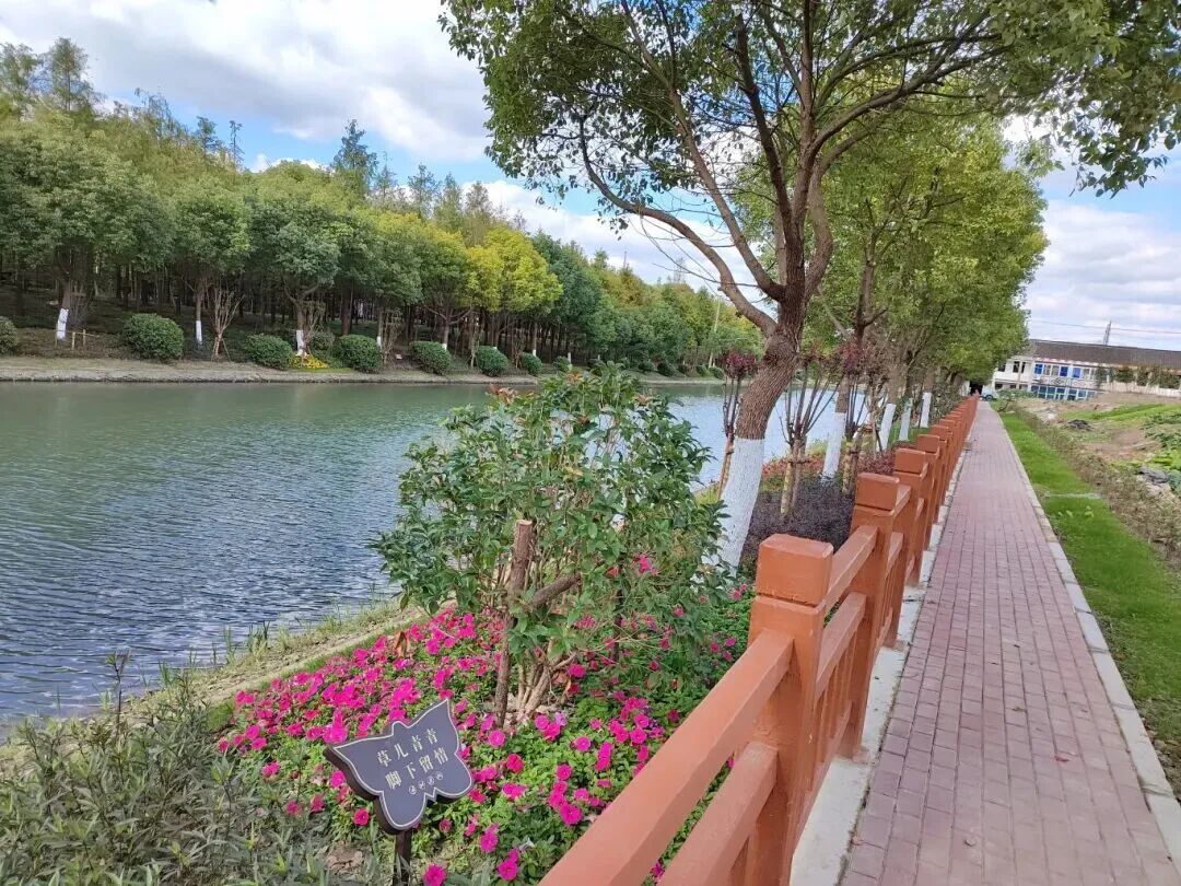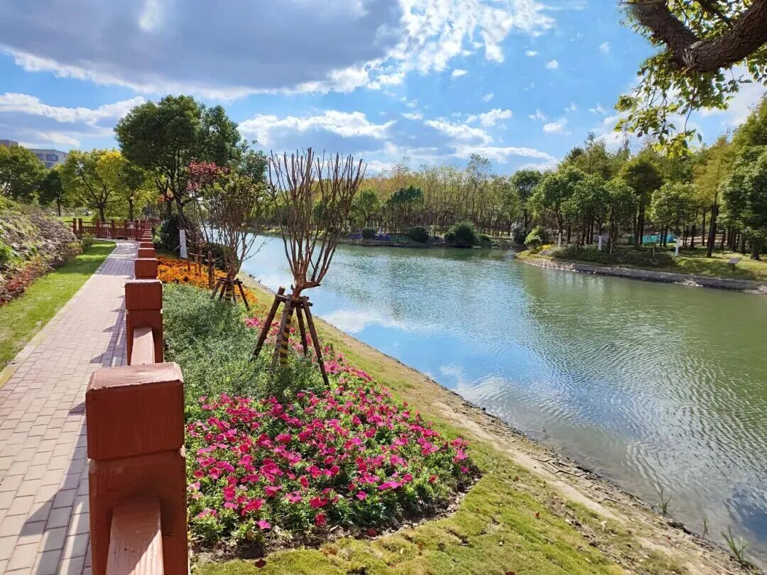 仿木护栏静立岸边,步道如玉带蜿蜒而行,步移景异,时光悄然流转。