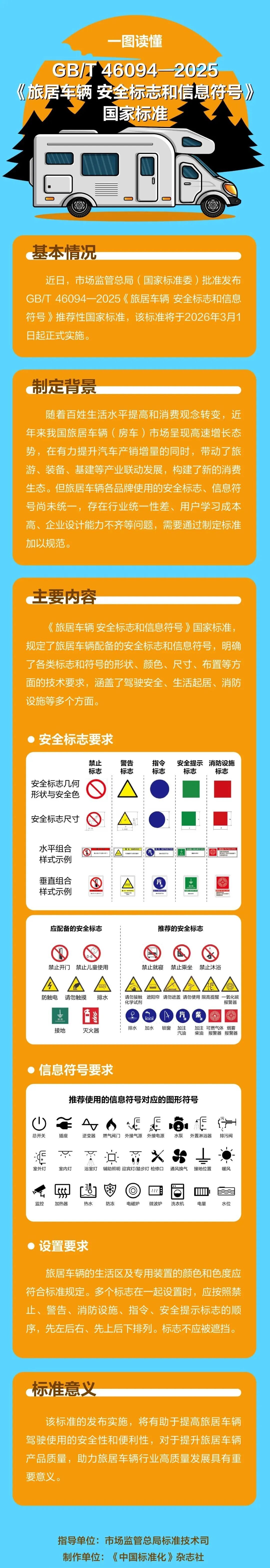 为规范旅居车辆设计、生产和使用,市场监管总局(国家标准委)组织制定了《旅居车辆 安全标志和信息符号》(GB/T 46094—2025)国家标准,规定了旅居车辆配备的安全标志和信息符号,明确了各类标志和符号的形状、颜色、尺寸、布置等方面的技术要求,涵盖驾驶安全、生活起居、消防设施等多个方面。该标准要求旅居车辆在关键区域张贴醒目提示标志,用直观方式帮助使用者规避风险,例如,在床铺旁设置“禁止在行车过程中就寝”标志、在卫生间门口设置“行车过程中请勿沐浴”标志等,提醒使用者避免危险行为,通过直观提示帮助更多人快速掌握旅居车辆使用规范,增强车辆安全使用意识,让每一次“移动小家”的出行,都能在安全护航下更安心、更舒心。