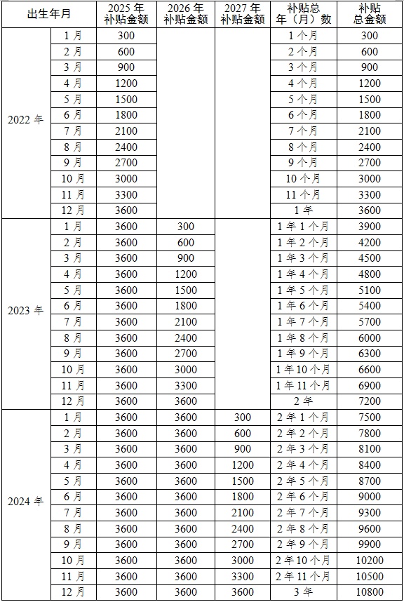 2022-2024年各月份出生婴幼儿育儿补贴金额对照表