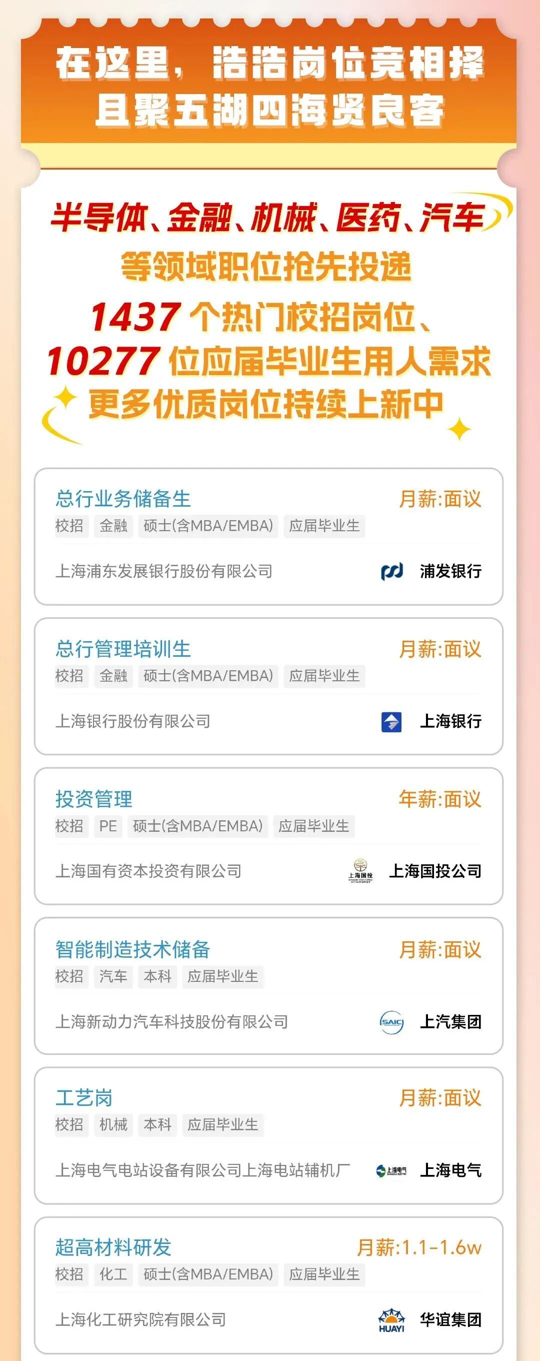 据市国资委介绍,“骐骥秋实”上海国资国企2026届高校毕业生校园招聘正式启动。本市地方国有企业提供1437个优质校招岗位、10277个应届生用人需求,欢迎2026届高校毕业生了解参与。详见↓