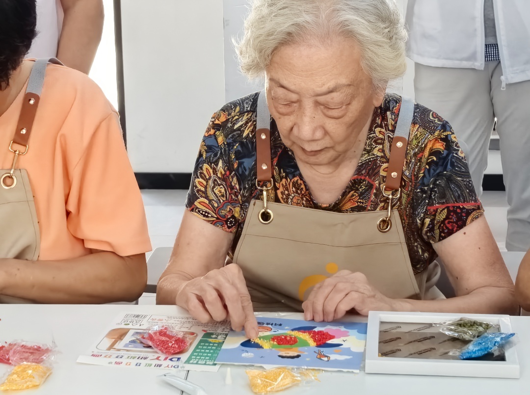 手指操热身结束,材料画创作正式开启。老人们手持胶水,将颗粒分明的创作材料细细拼贴在画板上。不一会儿,城门、火箭等鲜活的造型在指尖诞生,色彩斑斓的画作里藏着满满的创意与活力。“大家一起动手说笑,比闷在家里强多了,脑子越用越灵光。”曹叔叔边调整画面边感慨,他觉得这类社交活动正是预防认知衰退的好方法。