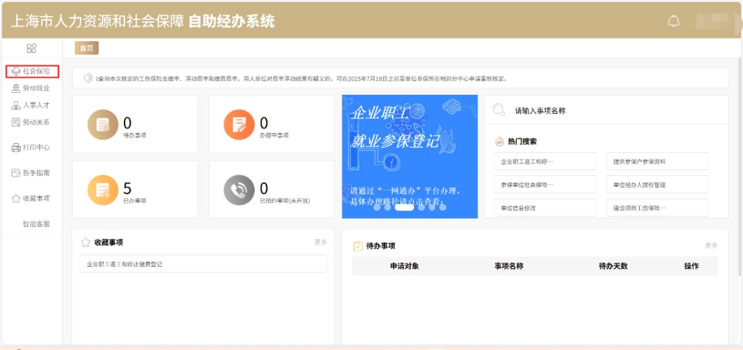 登录“上海市人力资源和社会保障自助经办系统”(网址:https://zzjb.rsj.sh.gov.cn/zzjbdl/),点击左侧导航栏的“社会保险”。