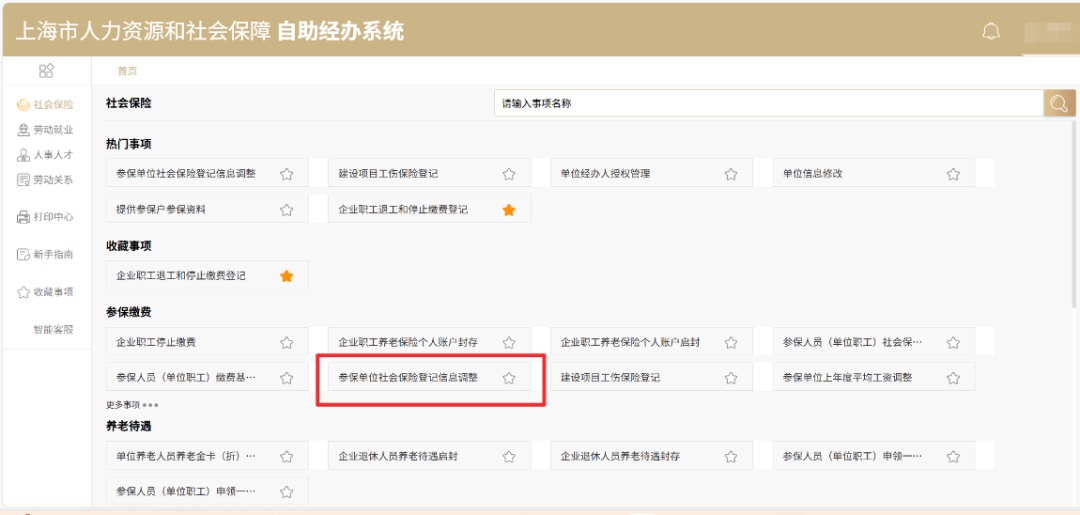 在“参保缴费”栏目中点选择“参保单位社会保险登记信息调整”事项。