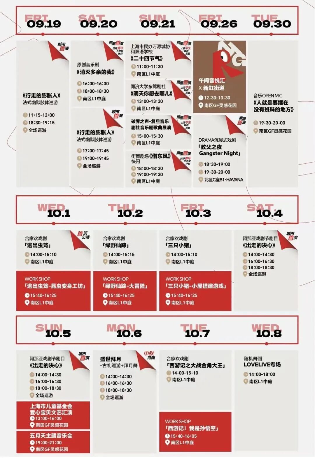 针对不同客群,活动还设置专属内容:国庆期间,《绿野仙踪》《三只小猪》等合家欢戏剧将陆续上演,配套主题工作坊同步开放;小红书二次元主题展则瞄准年轻群体,为社区注入次元文化活力。