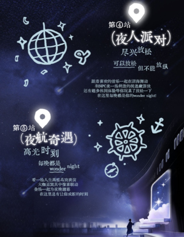 第五站:「夜航奇遇」高光时刻,这里有从登船开始全程为夜人们打造仪式感拉满的梦幻旅程,看一场人生高空马戏梦幻表演,遇见自己的夜晚巅峰时刻。