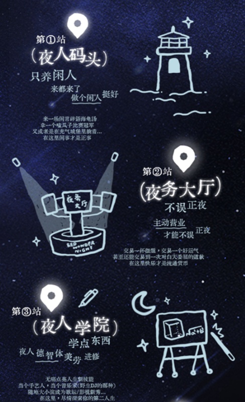 第二站:「夜务大厅」不误正夜,这里万物皆可交易,可以在这交易一杯微醺、交易一个好运气、白天受了委屈,也可以来这里交易你想要的花式道歉......总之,请相信你和你的夜晚所有的一切都充满价值。