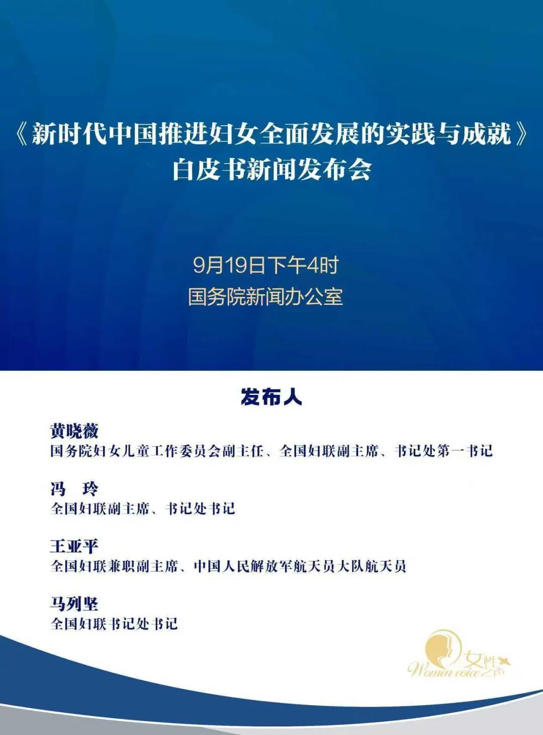 国务院新闻办公室将于9月19日(星期五)下午4时举行《新时代中国推进妇女全面发展的实践与成就》白皮书新闻发布会,请国务院妇女儿童工作委员会副主任、全国妇联副主席、书记处第一书记黄晓薇,全国妇联副主席、书记处书记冯玲,全国妇联兼职副主席、中国人民解放军航天员大队航天员王亚平和全国妇联书记处书记马列坚介绍白皮书有关情况并答记者问。 届时,全国妇联女性之声微信视频号、微博、快手、抖音……等平台将同步转播。 全国妇联女性之声视频号 全国妇联女性之声微博 全国妇联女性之声抖音 全国妇联女性之声快手 敬请关注! 来源:全国妇联女性之声 戳这里为我加颗小星星⭐️ 公众号一言不合就改版, “星标”我才能更方便接收消息哦。 现在只需三步: