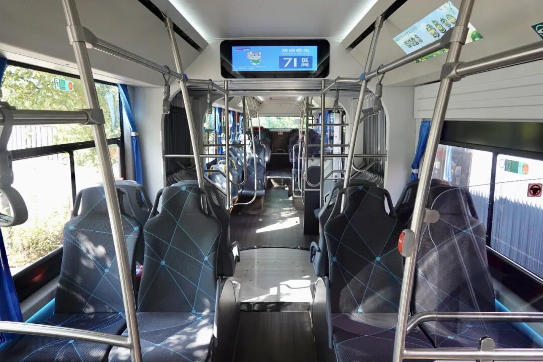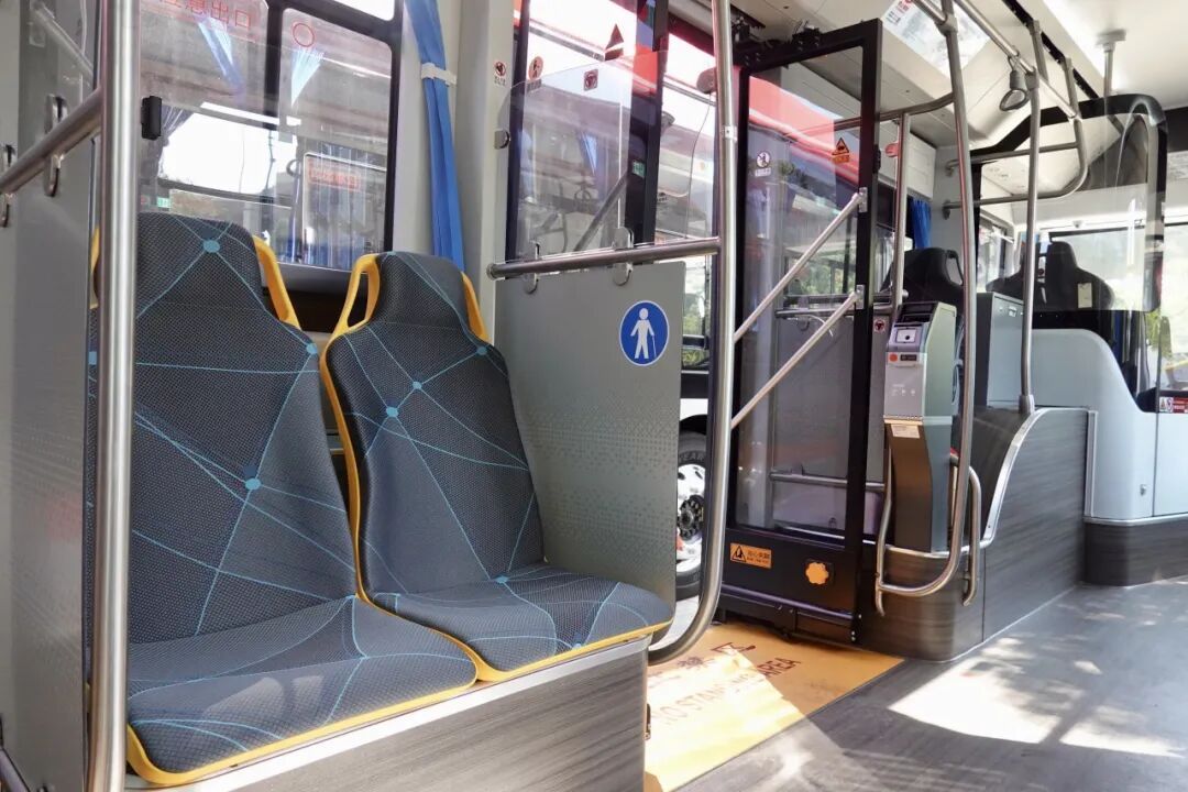 整车内饰采用上浅下深风格,简洁明亮。不锈钢扶手采用弯弧且不落地设计,既避免绊脚风险,又提高保洁效率。隐藏式空调出风口有效防止空调直吹,提升乘坐体验。座椅升级为柔软亲肤材料并增加头枕,舒适性进一步提高。车辆后部两排四个反向座位改为正向,省下内部空间增设行李架,方便携带行李的游客出行。