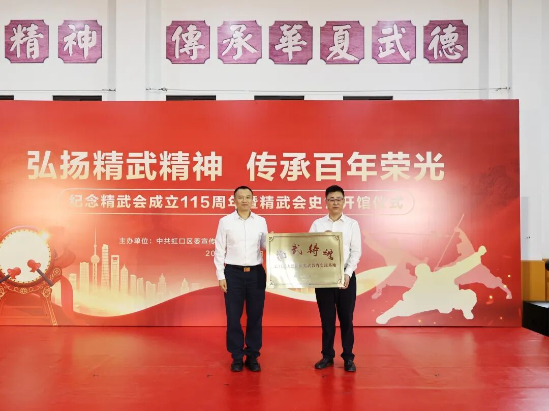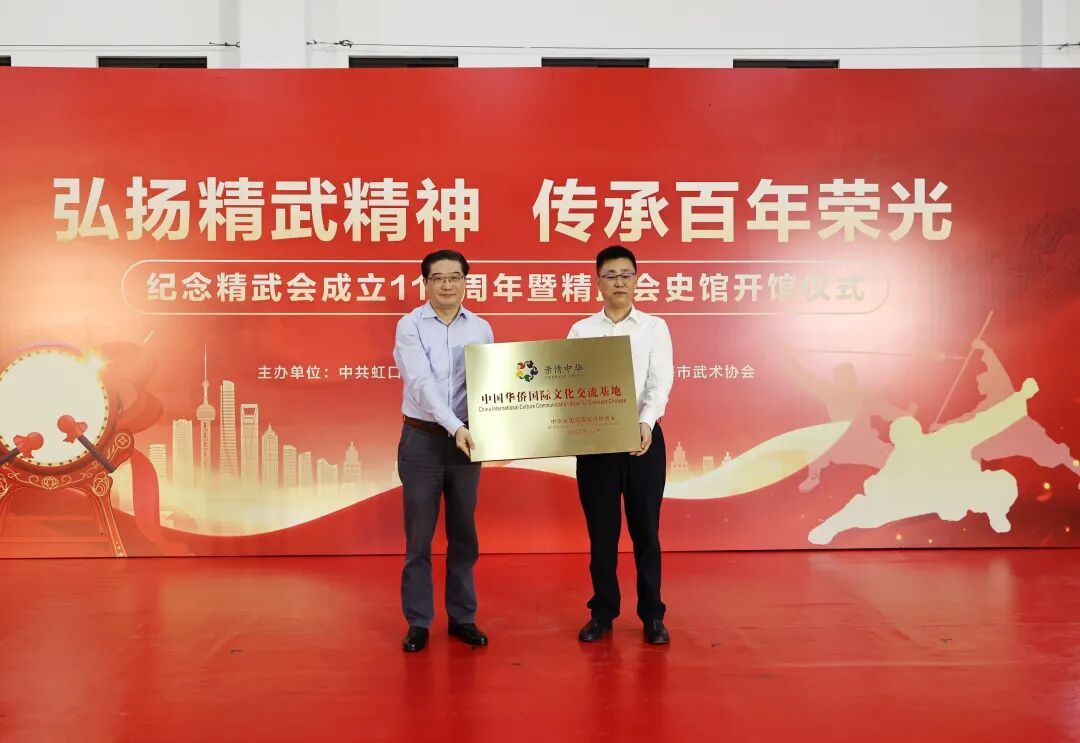 仪式上,区委宣传部向上海精武体育会颁授“尚武铸魂——虹口区大思政课精武教育实践基地”铭牌。区委统战部代表中国侨联向上海精武体育会颁授“中国华侨国际文化交流基地”铭牌。