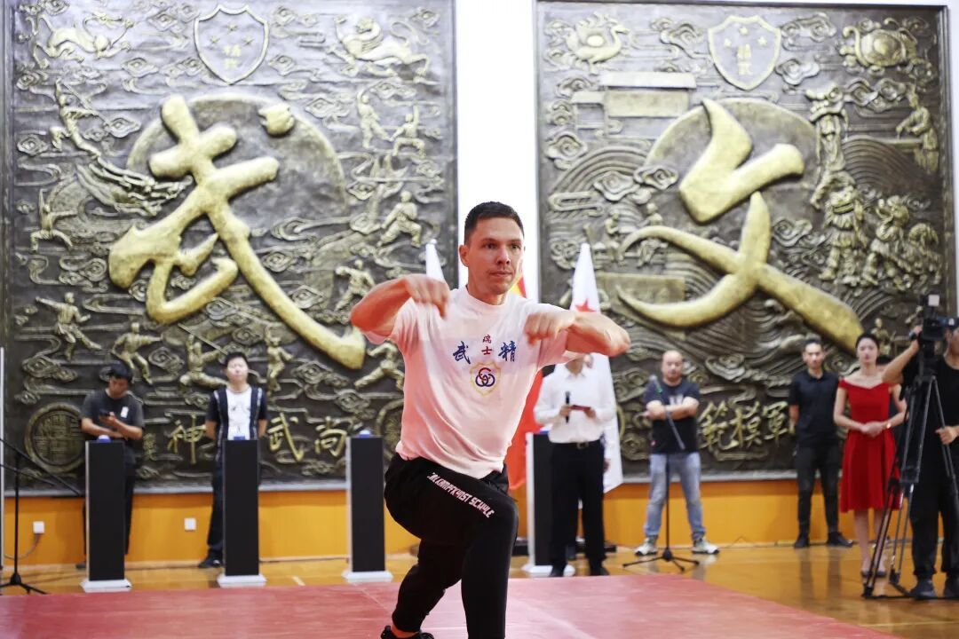 骆南辉作为国际精武友会代表致贺词,表达全球精武人对祖国深厚文化底蕴的敬意与共同推动精武事业发展的决心。