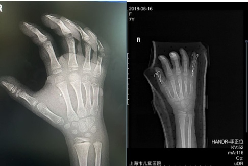 周日下午,7岁的女孩小雨(化名)在母亲使用压面机制作面食时,因好奇将右手伸入机器中。家长立即断电并小心翼翼将孩子的手取出,但见手掌迅速肿胀、变形,手指不能主动活动,孩子痛哭不止。家长随即将孩子送往当地医院。治疗2天后未见明显好转随即转至我院骨科。