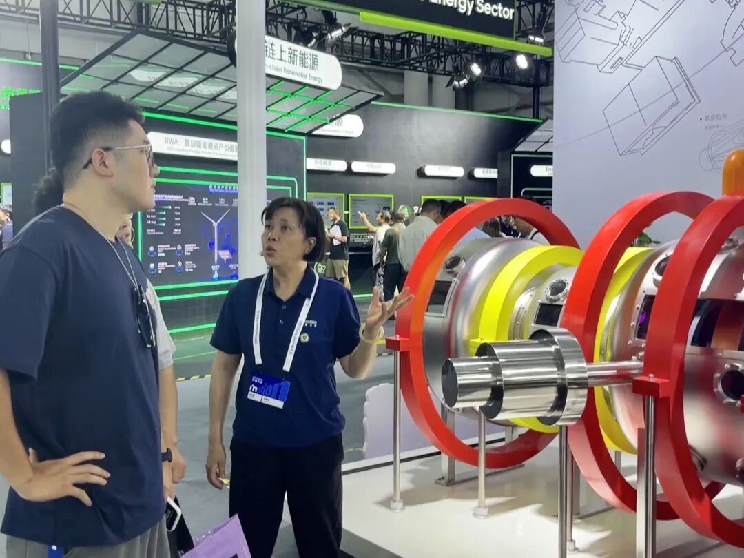 在“核聚变”展台前,宣讲团成员沉稳而自信地向中外来宾讲解。他们巧妙地将复杂的“可控核聚变”原理比作“人造小太阳”,用生活化的语言和饱满的热情,将尖端科技知识娓娓道来。