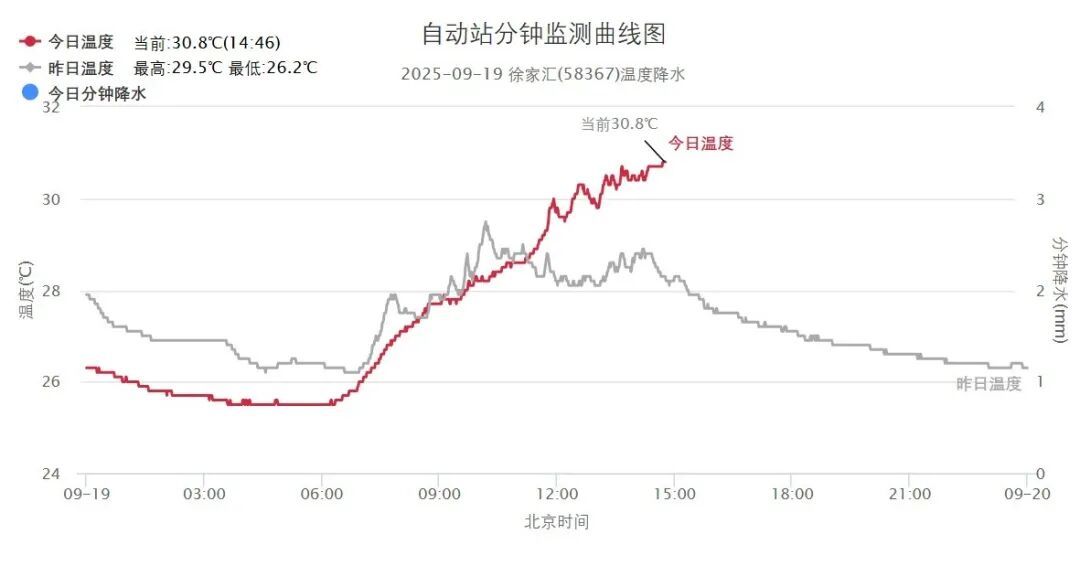 今天上午申城云系较厚,中午天空逐渐打开,阳光回归。午间气温走高,市区徐家汇站最高气温30.8℃。湿度大,体感有些闷热。