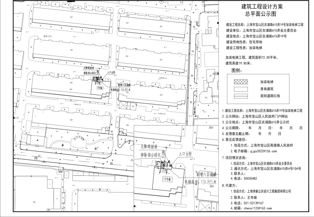 老旧小区加装电梯是民生工程,也是民心工程。近年来,宝山区一直在积极推进既有住宅加装电梯,取得显著成效。近日,宝山区高境镇吉浦路615弄19号、宝山区高逸路201弄1号2处多层住宅将加装电梯,目前设计方案正在公示中,为宝山“加梯”开启加速度。详见↓ 宝山区高境镇吉浦路615弄19号多层住宅加装电梯项目设计方案 公示网站:宝山区政府门户网站 公示现场地点:吉浦路615弄小区宣传栏 公示期限:2025年9月10日至2025年9月19日 反馈意见截止期:2025年9月26日 上海市宝山区高境镇人民政府 电子邮箱:gjzsqb@163.com(邮件名称、主题中应标明公示名称) 信函方式:上海市宝山区吉浦路615弄业主委员会 通讯地址:上海市宝山区吉浦路615弄4号104室 联系电话:021-55035482 信函方式:上海琪睿立庆设计工程集团有限公司 联系人:王冬妹 联系电话∶021-52139167 电子邮箱:chensl123@163.com 宝山区高逸路201弄1号多层住宅加装电梯项目设计方案 公示网站:上海市宝山区政府门户网站 公示现场地点:上海市宝山区美岸栖庭小区公示栏 公示期限:2025年9月10日至2025年9月19日 反馈意见截止期:2025年9月26日 上海市宝山区高境镇人民政府 电子邮箱:gjzsqb@163.com(邮件名称、主题中应标明公示名称) 信函方式∶上海市宝山区美岸栖庭第四届业主委员会 通讯地址∶上海市宝山区高境镇国权北路828弄139-142号 邮编:200438 代建单位:上海溢方电梯工程有限公司 电子邮箱:1151128006@qq.com 联系电话∶13301696275