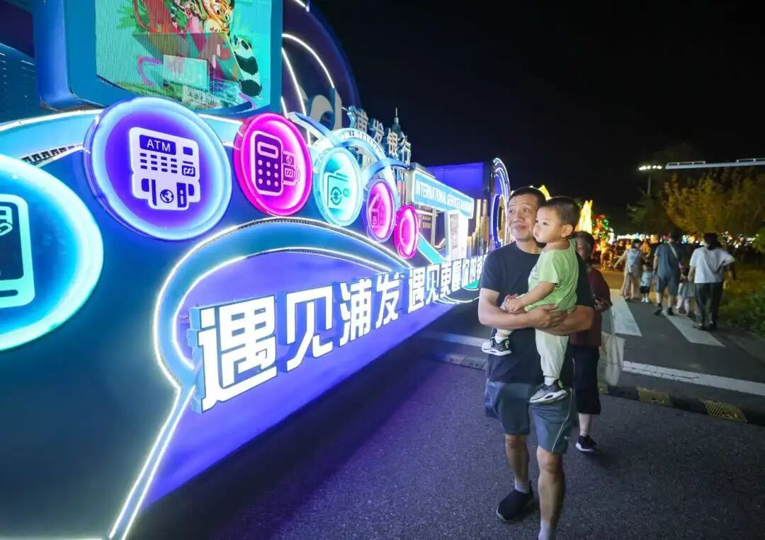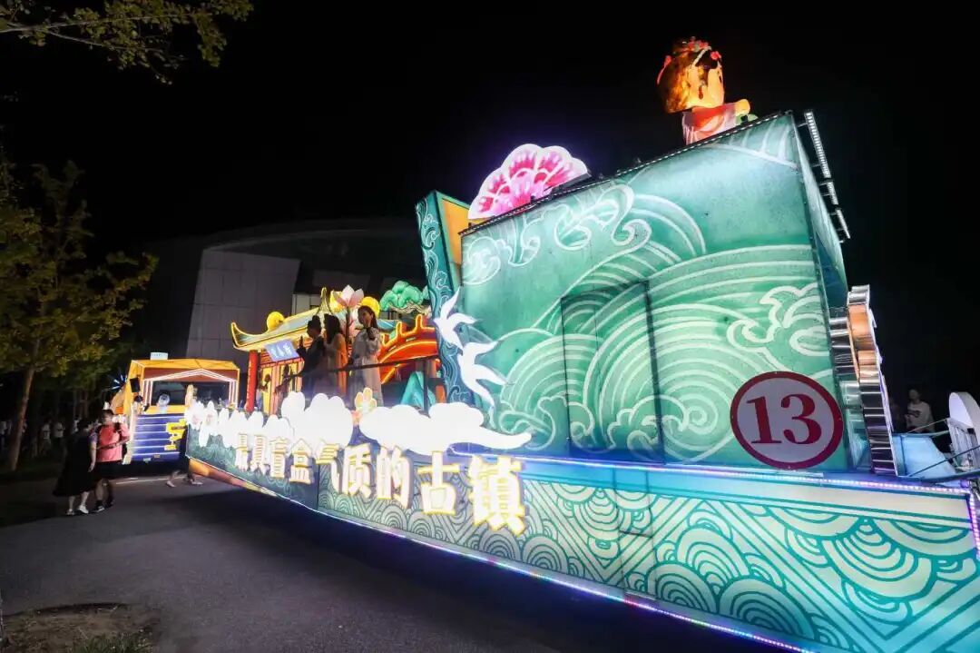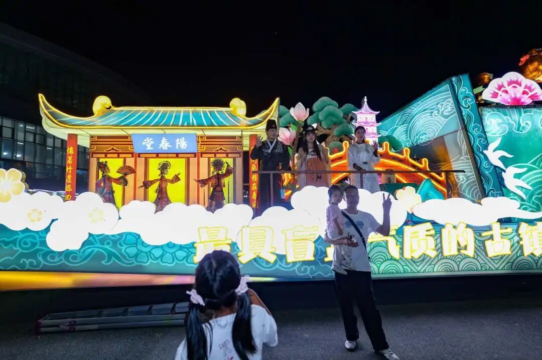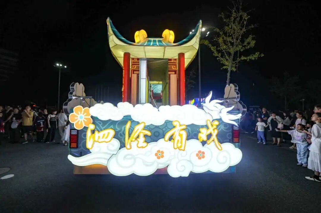 在众多花车中,作为上海古镇代表之一的泗泾古镇花车“泗泾有戏号”格外引人注目。花车车头的巨大盲盒以水波纹路为底,如同泗泾塘缓缓流淌的碧波,在流动的光影下,模拟出河面粼粼的波光。当盲盒打开,“泗泾有戏”的IP人物“小泗”和“菁泾”闪亮登场:“小泗”身着明代书生服饰,尽显古镇人文气息,“菁泾”以昆曲旦角行头登场,灵动展现泗泾古镇的非遗魅力。“现场有好多人,气氛很热烈。”家住附近的朱女士激动地说,“第一眼就看见古色古香的‘泗泾有戏号’,将古风和现代元素融入在一起,特别有趣。”
