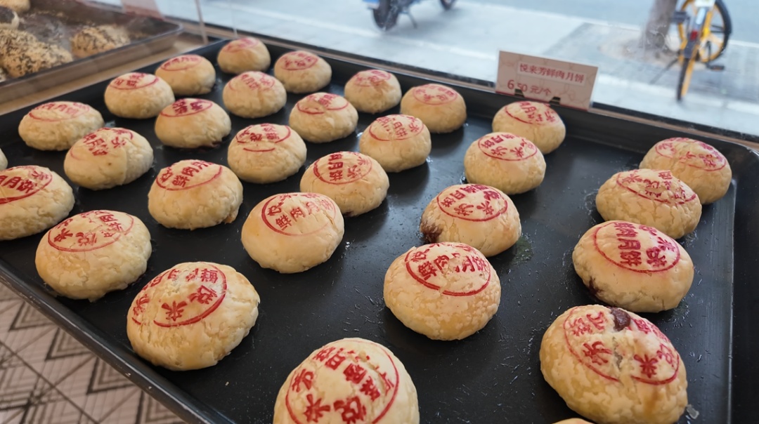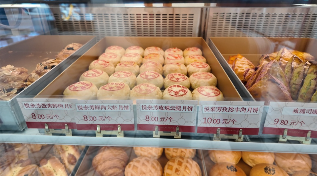 在普陀区老字号悦来芳(兰田店)的门店外,热腾腾的酥皮香气吸引不少顾客排队。除了经典的鲜肉月饼,今年悦来芳还推出鲜肉大虾、孜然牛肉和玫瑰云腿等新口味。其中玫瑰云腿口味运用了来自云南帮扶地区的花瓣和云腿,咸甜交融,颇受上海市民喜爱。