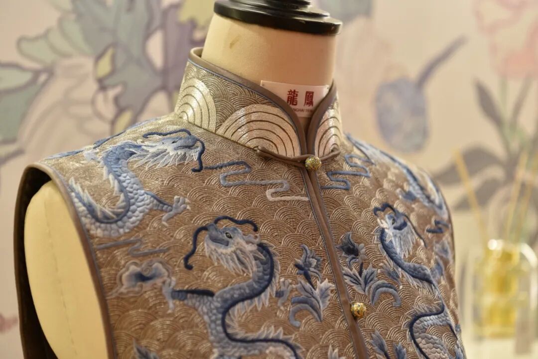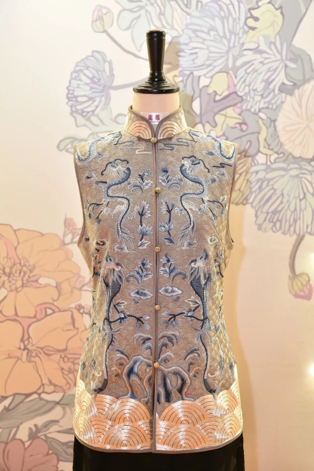 龙凤旗袍带来的“九霄龙吟”苏绣盘银马甲,让参观者惊艳地发现,原来非遗技艺不只是展品,也可以是生活中的“日常美学”。这件历时半年纯手工绣制完成的中式马甲,以灰色真丝素缎为底,用银线勾勒出九龙腾跃、海浪奔涌的恢弘画面,并融入江崖海水、蝙蝠缠枝莲等传统吉祥元素。现代感的服装廓形与雅致的配色,使得这件马甲可以“适配”不同季节和场合,成为穿在身上的“移动中式风景”。
