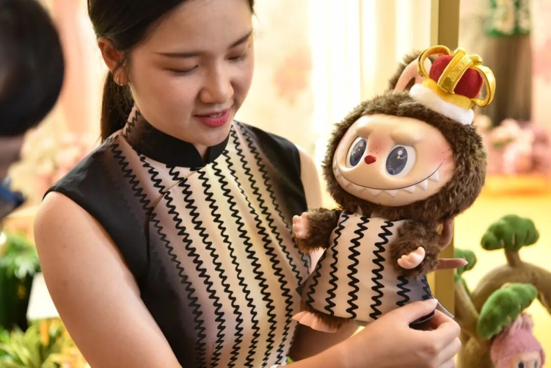 展区内,龙凤旗袍手工制作技艺第四代传承人吴雨婷正抱着“人偶同款”着装的LABUBU向大家介绍龙凤和亨生最新推出的“匠心趣作”新中式娃衣系列。