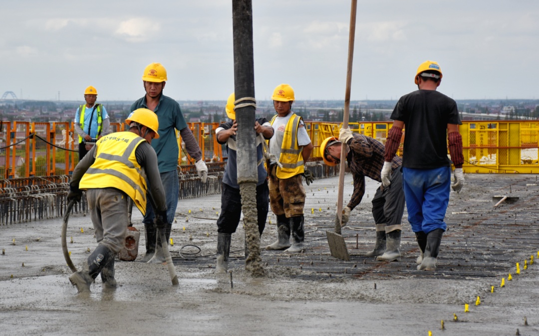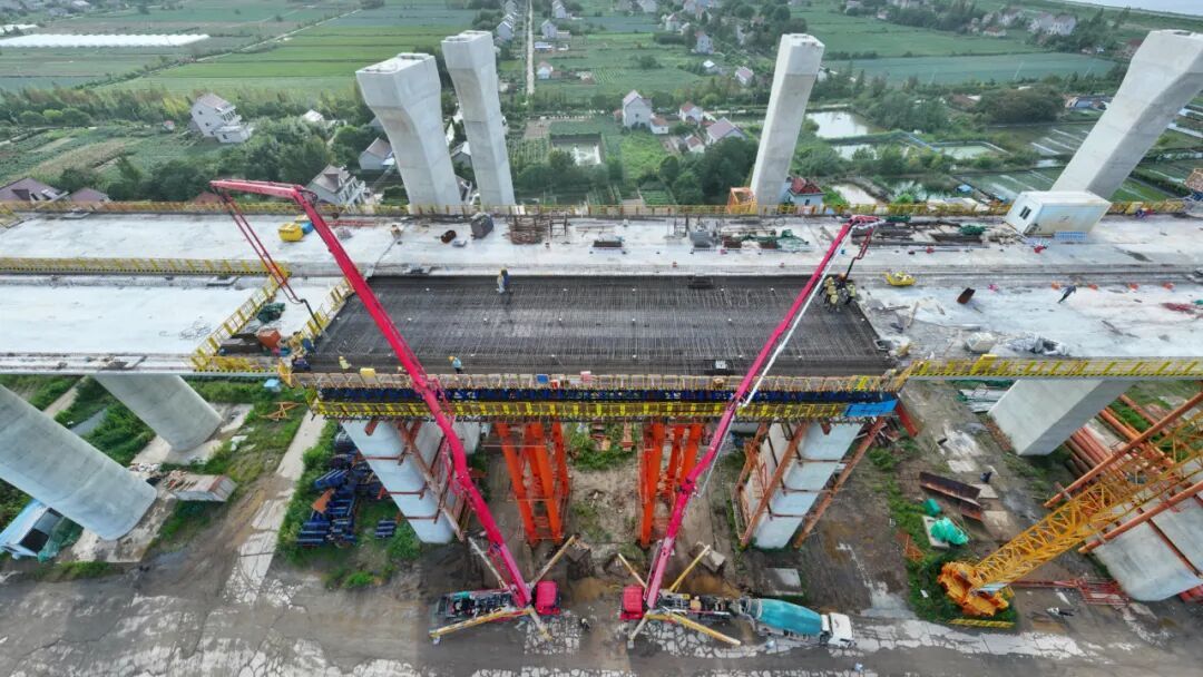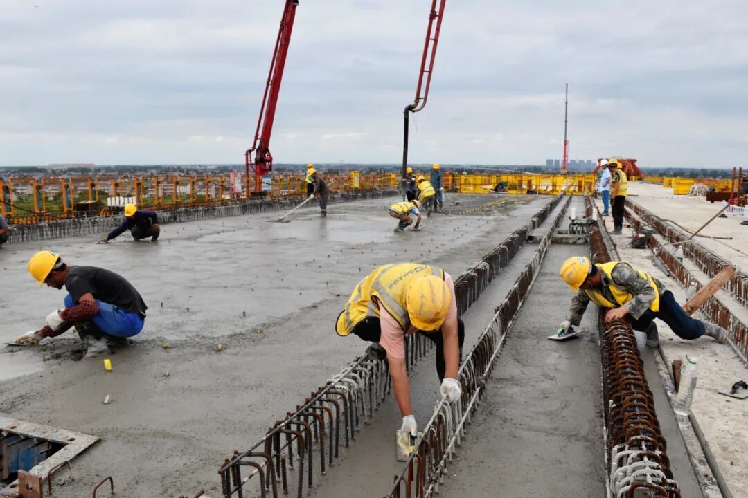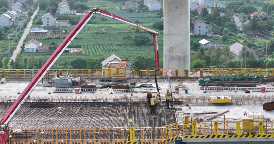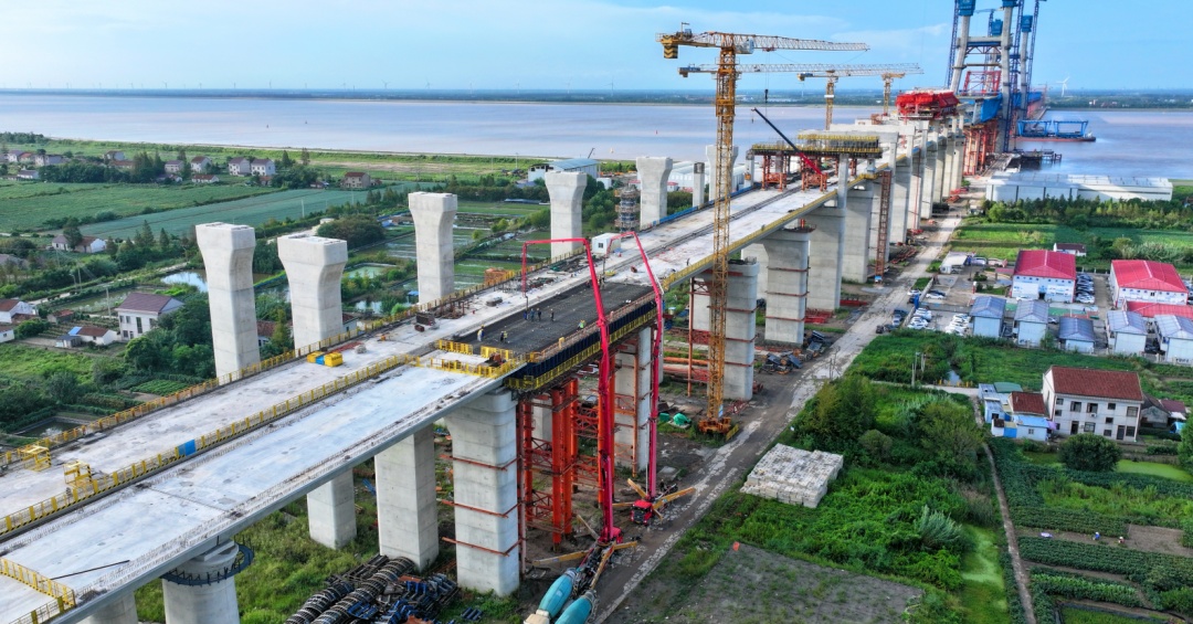 随着混凝土泵车将混凝土源源不断地浇筑在大桥上,30多名施工者正在为长达40.7米、重量超过千吨的简支梁浇筑混凝土。中铁大桥局沪渝蓉高铁V标项目部北岸工区负责人范志晶介绍:“崇启公铁长江大桥4号墩塔身目前开累高度到150.5米,北引桥高铁侧现浇梁14孔全部完成,城际侧现浇梁开累完成16孔,预计今年浇筑完成。”