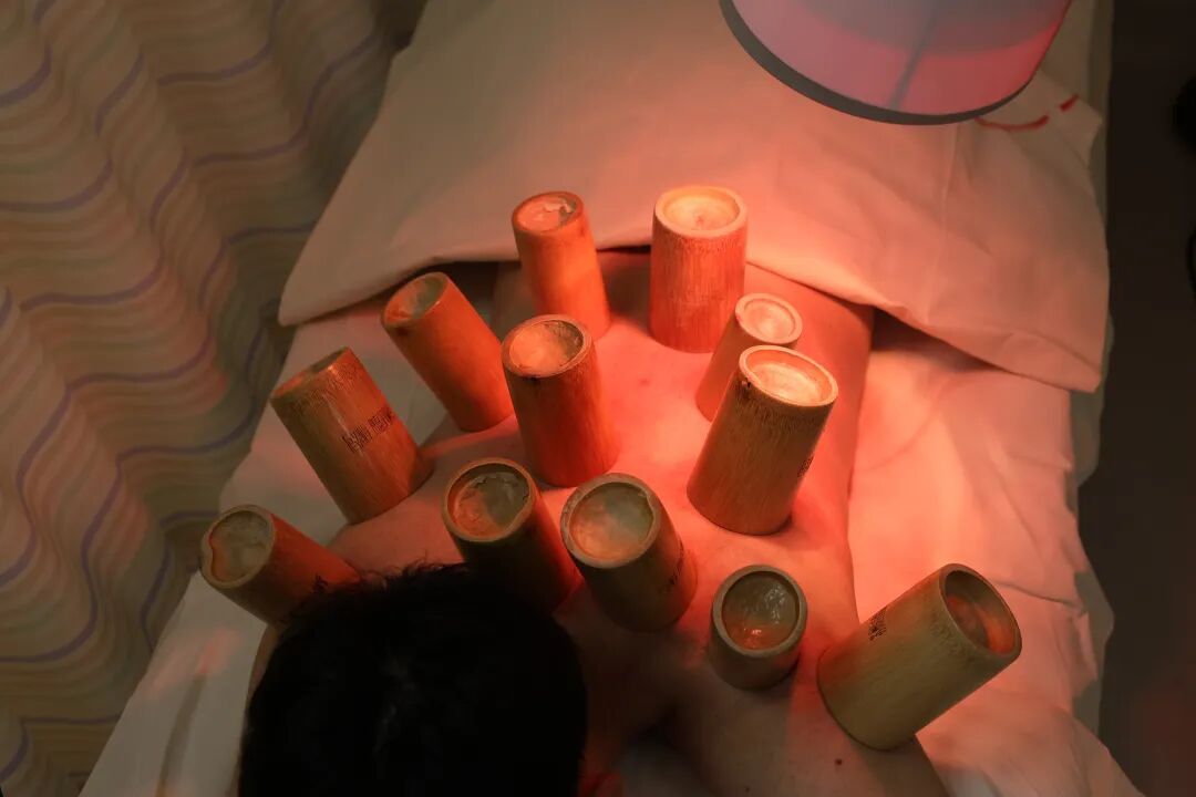在中医综合治疗区,首次体验中医夜门诊的缪女士肩颈酸痛,导致肩部活动受限,中医专科护士王玉秀根据医生的诊疗结果,安排了刮痧、走罐、中药热敷等项目,以此来缓解她的症状。