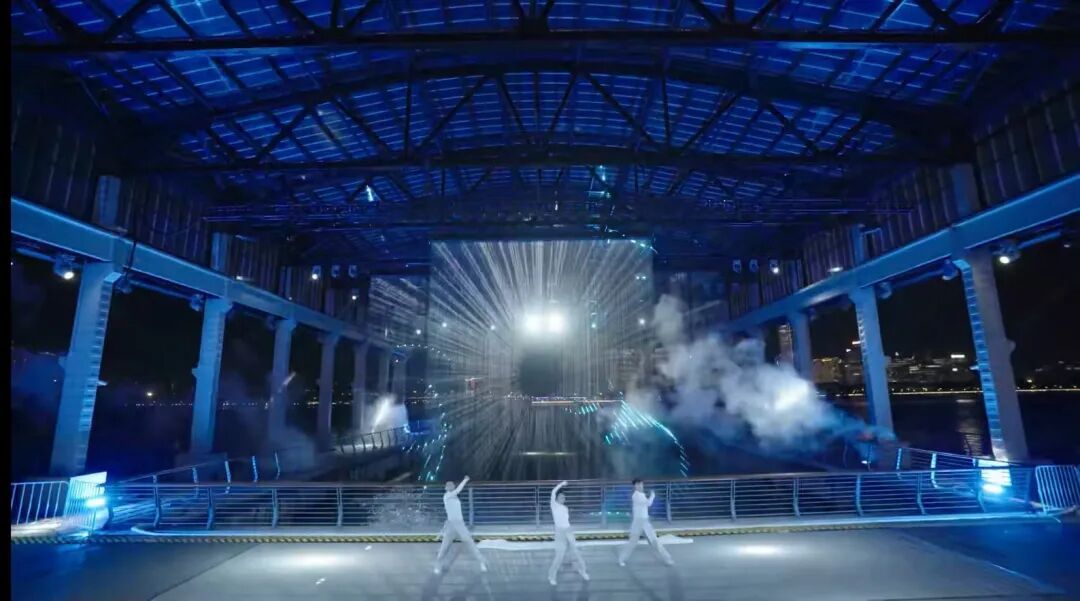 坐在船坞的台阶上吹江风,抬头就是重头戏:船坞光影剧场《数字潮涌》。冷焰火划破夜空,现代舞艺术家踩着光影起舞,“科技数据”化作流动的光影。这不仅是视觉盛宴,更把徐汇“科创水岸”的理念具象化,算力、人工智能与城市发展的融合,都藏在这场动态光影里。