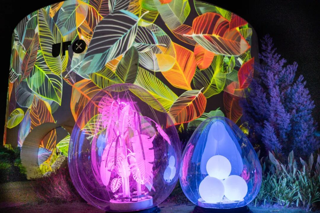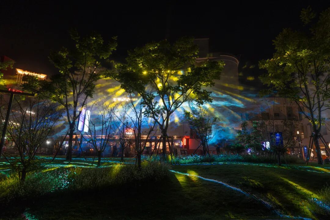 这里的工业油罐变身为“光影城市绿洲”,气膜之内藏着一片可听可感的“梦幻森林”。繁星灯洒落草坪,闪光灯球缓缓旋转,配合舒缓的白噪音,瞬间将你带入静谧而治愈的夜间花园。