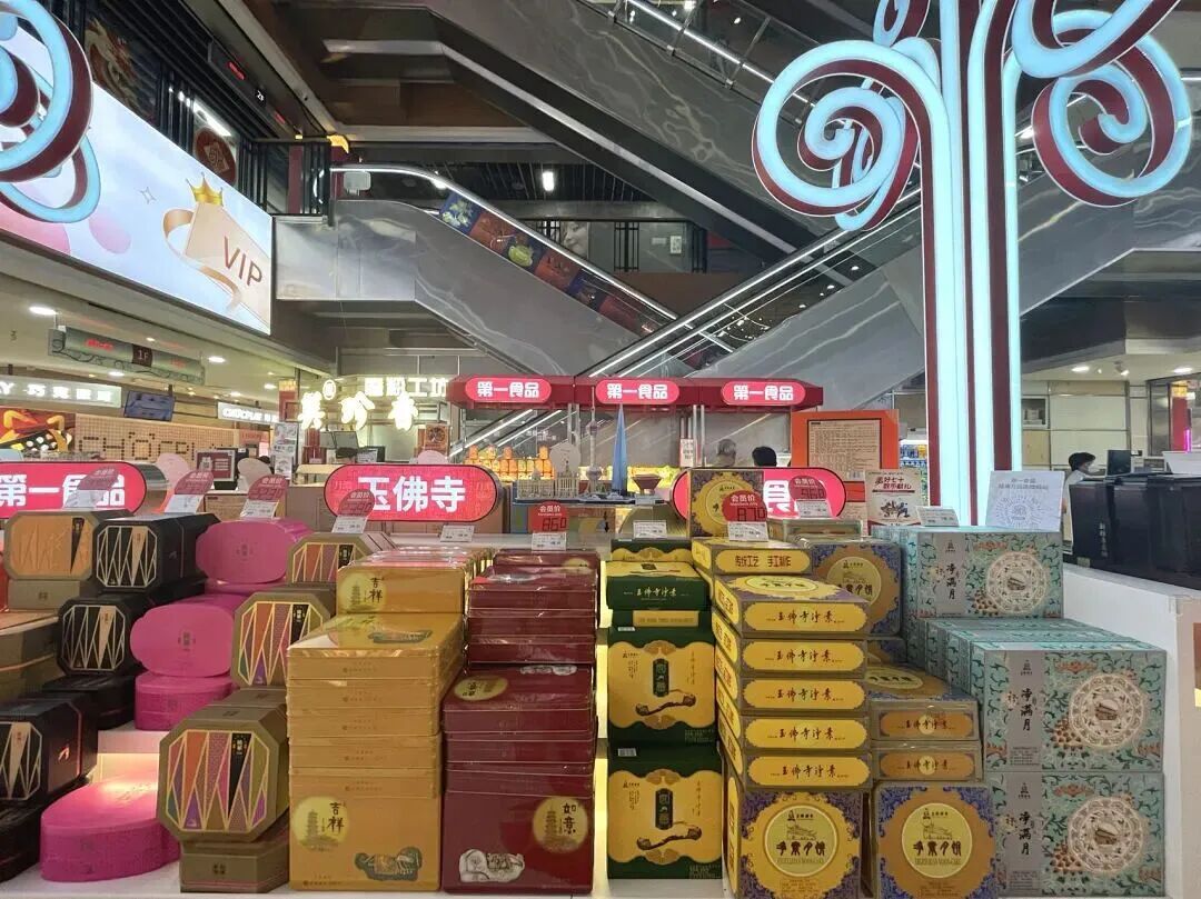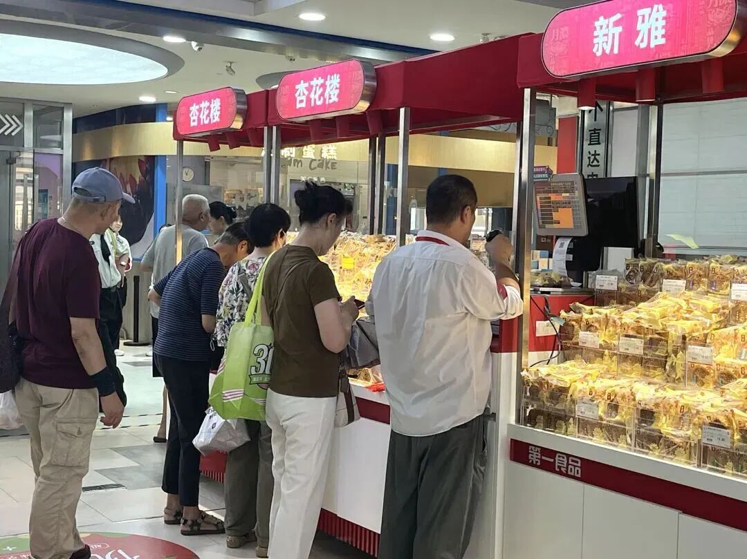 上午十点刚过,第一食品杨浦店内已有不少顾客在月饼专区前有序排队。真老大房、泰康、龙华禅食等老字号柜台前人潮渐涌,现烤月饼的香气扑鼻而来,伴随着师傅们忙碌的身影,今年中秋市场的序幕正式拉开。
