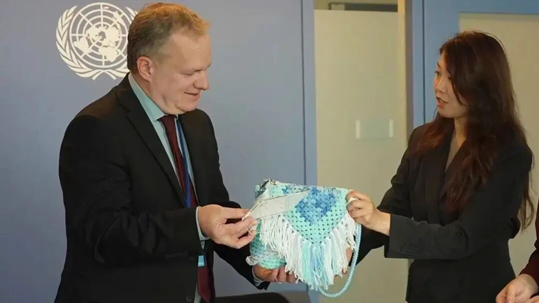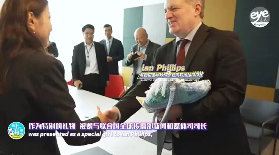 “Very beautiful!”联合国全球传播部新闻和媒体司司长Lan Phillips在接过莘庄实验小学学生设计的钩针编结包时由衷赞叹,“这个包的蓝色也正好也是联合国色,很漂亮,我特别喜欢。”