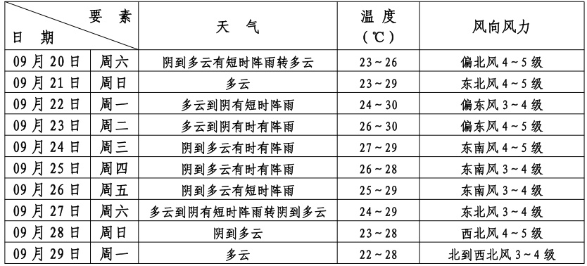 据最新气象资料分析:受偏东气流影响,未来十天本区云系较多,多阵雨天气;24日前后受台风槽与冷空气共同影响,本区有一次较明显降水过程。