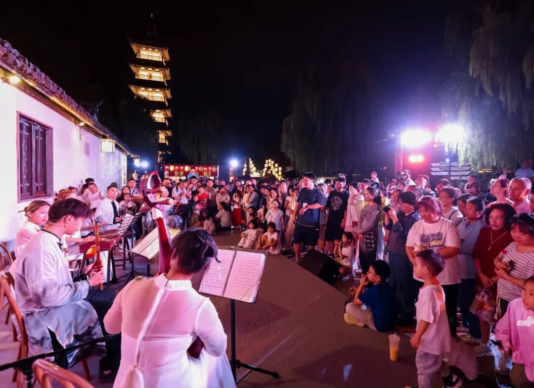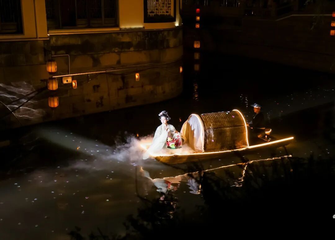 “青砖伴瓦漆,白马踏新泥……”在练祁河上,点点灯火随波荡漾,小舟缓缓而行。演员在船头轻声吟唱《声声慢》,清婉的歌声与潺潺水声相互呼应,勾勒出“水上听音,桥上观画”的诗意夜景。
