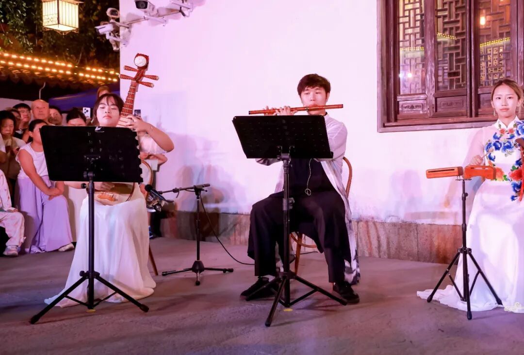 民清街沿线,一场“国潮乐集”跨界演奏快闪吸引了不少游客。江南丝竹演奏、民乐社团轮番登台演出,传统乐器与现代音乐元素在此交融碰撞,时而悠扬婉转,时而激情澎湃,展现“雅潮共赏、中西和鸣”的盛景。“能在这老街听到各种特色音乐,非常有意思。”市民刘先生举起手机记录。