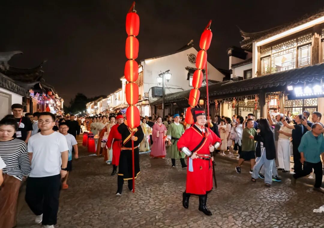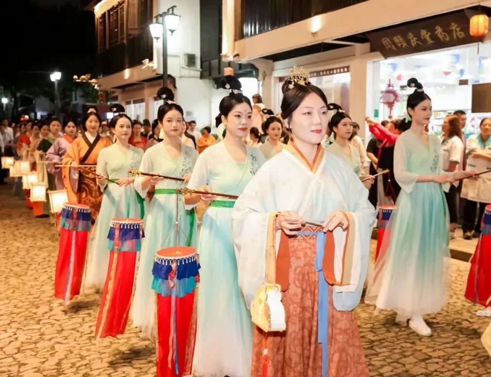夜幕下的州桥老街,人潮涌动。身着华美汉服的巡游队伍从南大街出发,经德富桥、南下塘街缓缓行进。衣袂飘飘、霓裳翩跹,引得游客纷纷驻足拍照。“仿佛穿越回古代了,孩子看到这么多漂亮的汉服小姐姐特别开心,嚷着要回家也换一身来。” 市民张女士兴奋地说。