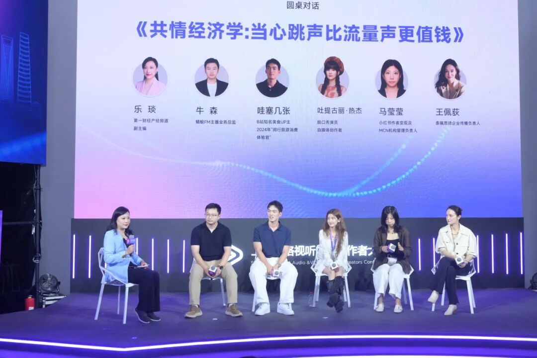 圆桌对话环节将大会推向高潮。第一财经乐琰与蜻蜓FM主播业务总监牛森、哔哩哔哩平台美食类UP主“哇塞几张”、脱口秀演员吐提古丽·热杰、小红书作者变现及MCN机构管理负责人马莹莹、泰佩思琦企业传播负责人王佩荻展开对话,谈论《共情经济学:当心跳声比流量声更值钱》。