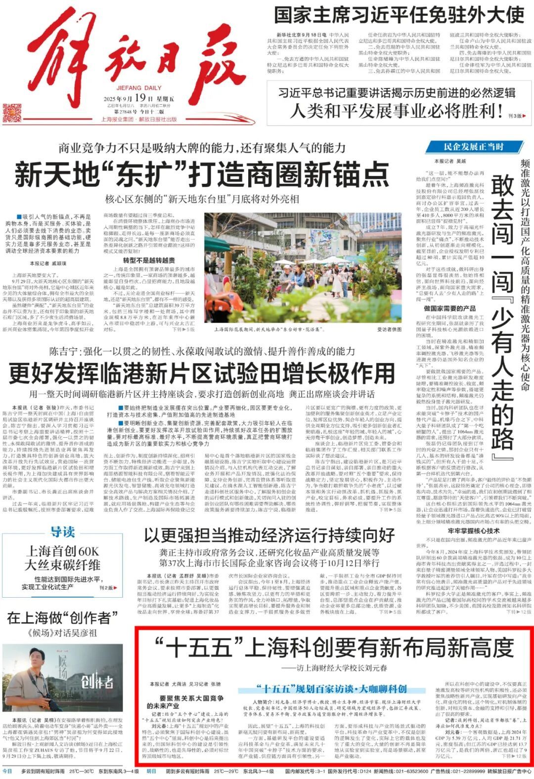 9月19日,《解放日报》01版刊发上海财经大学校长刘元春访谈《“十五五”上海科创要有新布局新高度》。