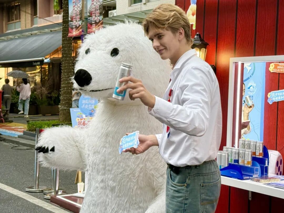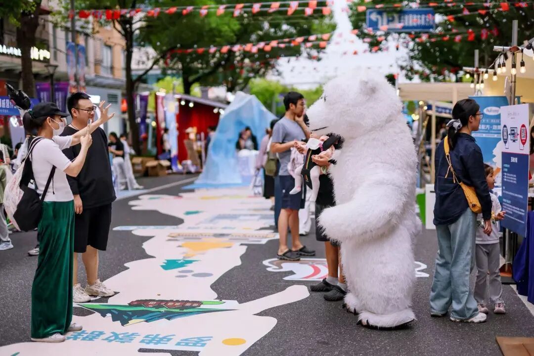 除了市集摊位的静态展示外,现场还设置了多个丰富的互动环节。其中,北极熊充气人偶和摄影打卡区最受欢迎,成为最具人气的限时打卡点。“北极熊玩偶很可爱,孩子特别喜欢,已经拍了十几张照片了。”市民王先生刚带孩子与北极熊人偶拍完合照,便立马来到了摄影打卡区“沉浸式”体验北欧风光。小朋友们乐此不疲,大朋友们也十分欢喜,成为这场限时步行街的主旋律。