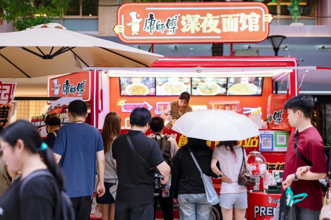 天色渐暗,康师傅“深夜面馆×三角洲行动”主题车亮灯——整辆红底战车被游戏角色包裹,像一头蓄势待发的“能量巨兽”。为了能让更多市民参与进来,摊位打卡规则十分简单:与“三角洲特种部队”立牌合影、带话题#泡在一起# 发社媒,即可兑换“新品尝鲜券”。