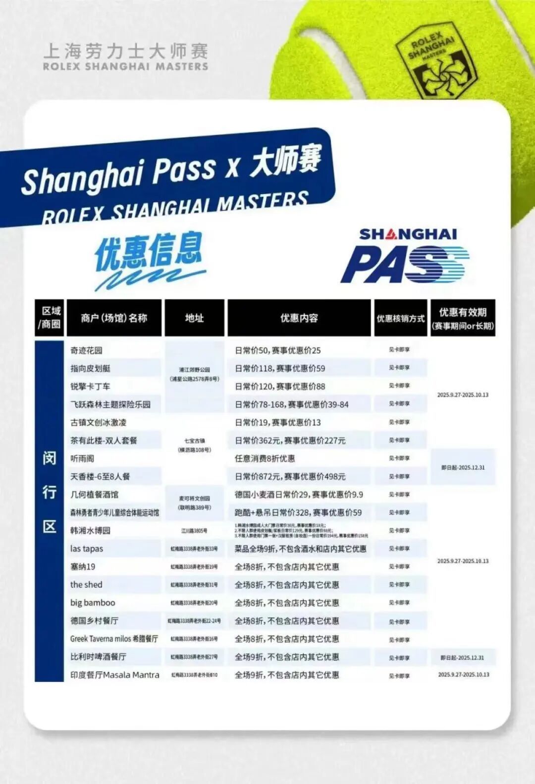 比如购买上海劳力士大师赛观赛票+1元可得价值超260元的Shanghai Pass一日通票,植入区内重点A级景区的优惠信息,游客出示Shanghai Pass卡,即可享受最大优惠。