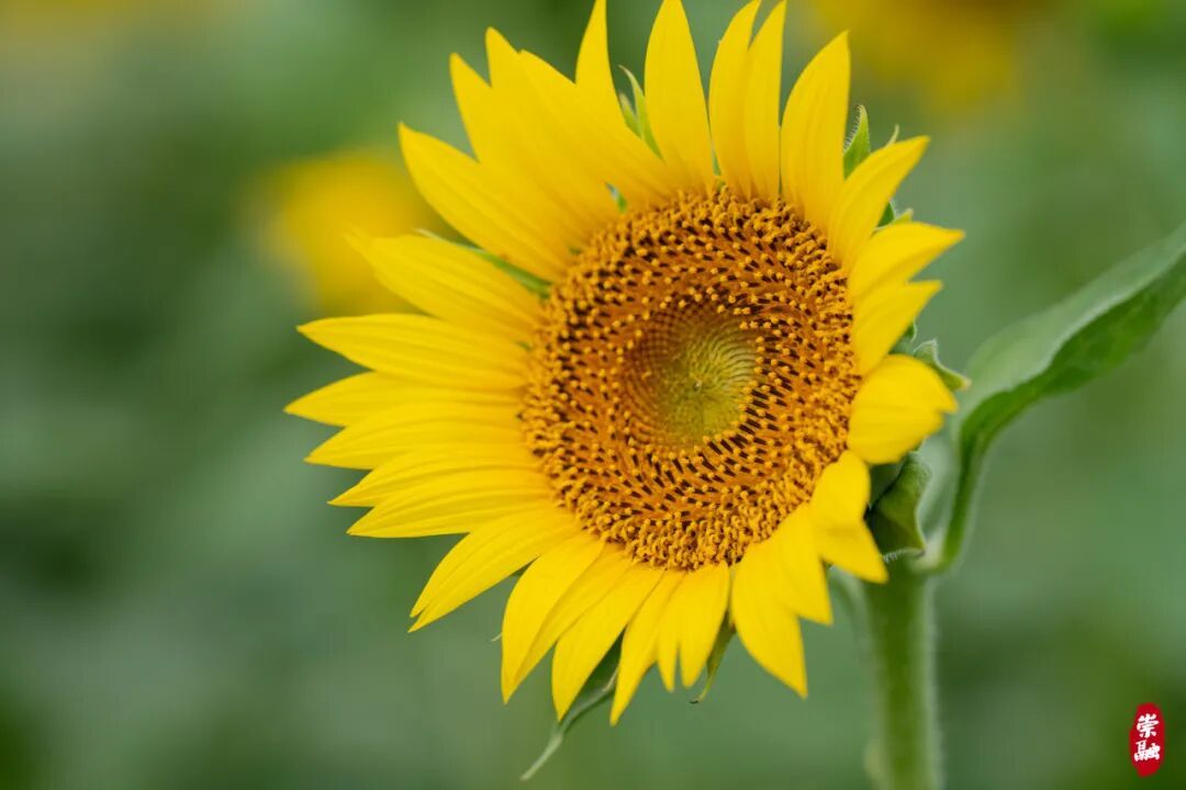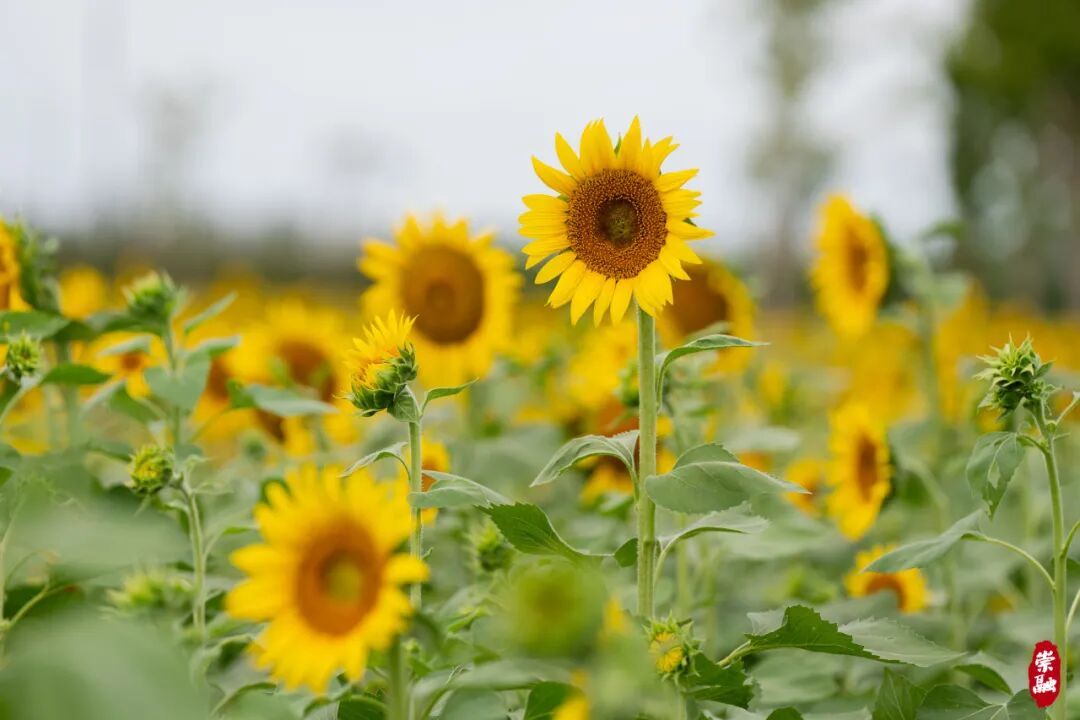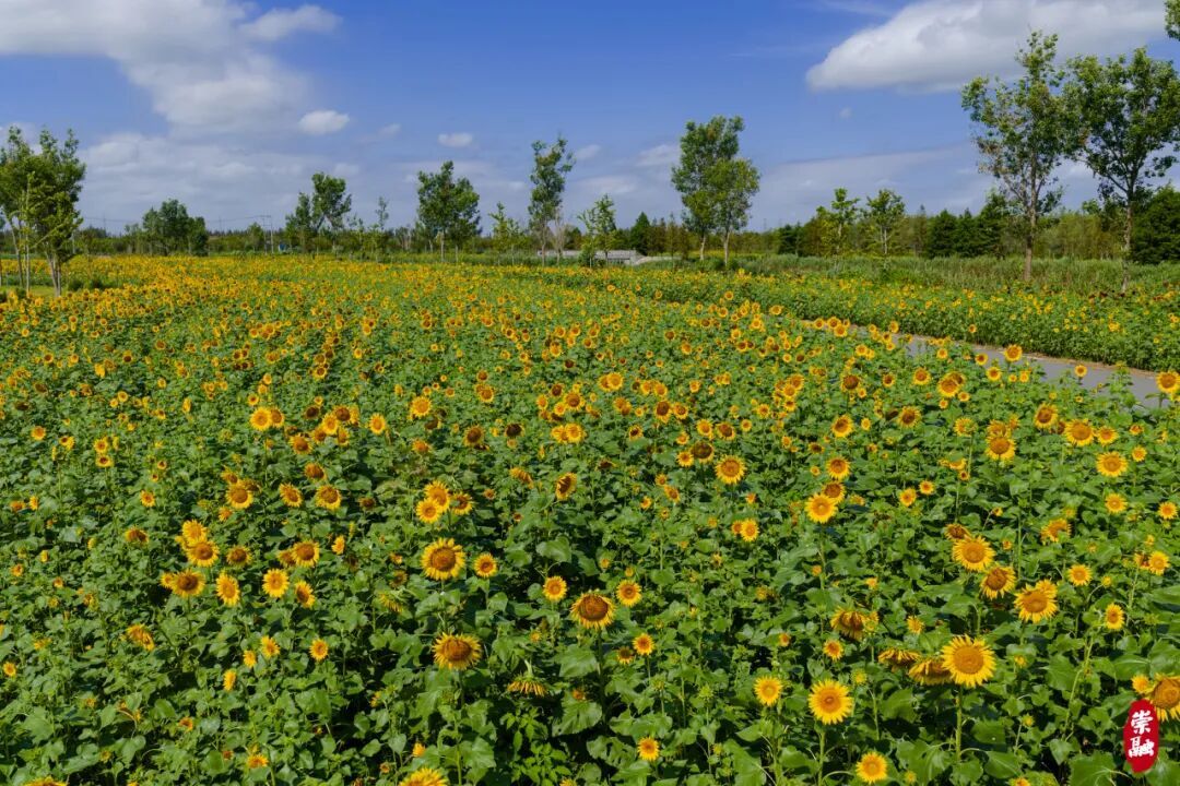 沿着蜿蜒步道深入光明田原景区,很快,视野被一片金色浪潮填满。沿湖栽植的向日葵植株青杆挺立,绿叶舒展,一朵朵金色花盘绽放如笑脸,在微风中摇曳生姿,漫步浪漫花海,令人赏心悦目。